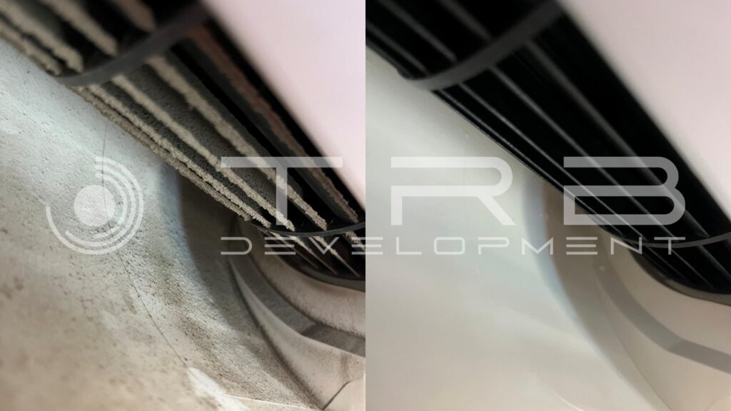 A készülék műanyag burkolatát-, légterelő lapátját-, szűrőit- és egyéb műanyag részeit is vegyszeres kezelés alá vetjük. Pár perc várakozás után a magasnyomású mosóval átmossuk a készülék részeit, melyre vegyszert permeteztünk.